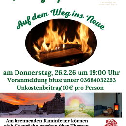 Am brennenden Kaminfeuer können sich Gespräche ergeben über Themen, die uns alle bewegen. Für Getränke und kleine Snacks ist gesorgt. Voranmeldung bitte unter 03684032263 Unkostenbeitrag 10 Euro pro Person.