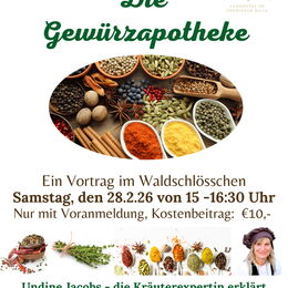 Vortrag - "Die Gewürzapotheke" - von Frau Undine Jacobs. Die Kräuterexpertin erklärt anschaulich, welche Gewürze im täglichen Gebrauch ihre Heilkraft entfalten können. Nur mit Voranmeldung, Kostenbeitrag 10 Euro