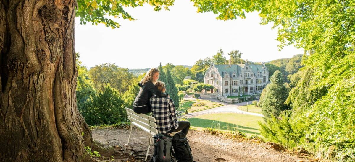 Dieser Rundweg verbindet alle wichtigen Sehenswürdigkeiten des Landschaftsparks: faszinierende Naturkulisse, Parkarchitekturen, das aufwändig von Hand angepflanzte Teppichbeet und das prachtvolle Schloss im Stil der englischen Spätrenaissance. Mit der BUGA 2021 gelangte der Park zu neuer Bekanntheit. Vom Start am Schloss verläuft der gut ausgebaute und befestigte Weg vorbei an der Teufelsbrücke, über den Morgentorfelsen, das Chinesische Häuschen und den Blumenkorbfelsen zurück zum Schloss.Stationen